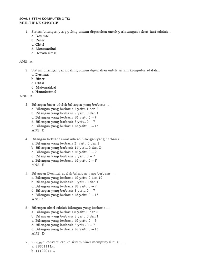3 responses to contoh soal dan jawaban konversi bilangan desimal biner oktal dan hexadesimal arya 3 september 2019 at 2006 saya rasa soal sama jawabannya salah coba periksa kembali. Contoh soal ini diperuntukkan untuk peserta didik di jenjang smp. Contoh soal persamaan nilai mutlak pilihan ganda jawab dan jawaban beserta pembahasan persamaan nilai mutlak adalah suatu nilai bilanganangka mutlak dari sebuah bilangan sehingga dapat juga dinyatakan sebagai jarak bilangan tersebut terhadap titik 0 pada garis bilangan tanpa memperhatikan arahnya. Soal dibawah ini sudah mencakup semua materi sistem komputer yang diringkas menjadi sebuah soal pilihan ganda. Contoh soal konversi bilangan beserta jawabannya konversi bilangan tata cara soal jawaban. Di kesempatan kali ini kami membagikan latihan soal sistem komputer, yang dikhususkan untuk siswa/i jurusan tkj, rpl dan sebagainya. Sebulan kemudian dibeli 10 lembar obligasi pt gatot nominal rp25 000 00 kurs 98 biaya pembelian sebesar rp2 000 00. Konversi bilangan soal konversi bilangan desimal ke biner contoh berapa bilangan … Lalu disini saya akan memberitahu kekalian. Mengenal unit link asuransi dengan fitur investasi cermati. Aug 18, 2021 · sistem komputer sendiri terbagi menjadi 3 komponen utama yakni, hardware, software dan brainware. Soal yang saya dapatkan disini diambil dari beberapa referensi yang ada di google. Contoh latihan soal akm kelas 8 smp mts tahun 2021 beserta kunci jawabannya atau pembahasannya.
